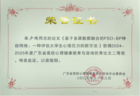 作为分管领导,陈少鸿副书记始终将心理健康教育融入育人全过程,积极推动学院心理工作机制完善、队伍建设及活动创新,着力营造健康和谐的成长氛围。其获奖论文《基于多源数据融合的PSO-BP神经网络:一种评估大学生心理压力的新方法》,体现了我院在心理育人领域的科学探索与实践深度。