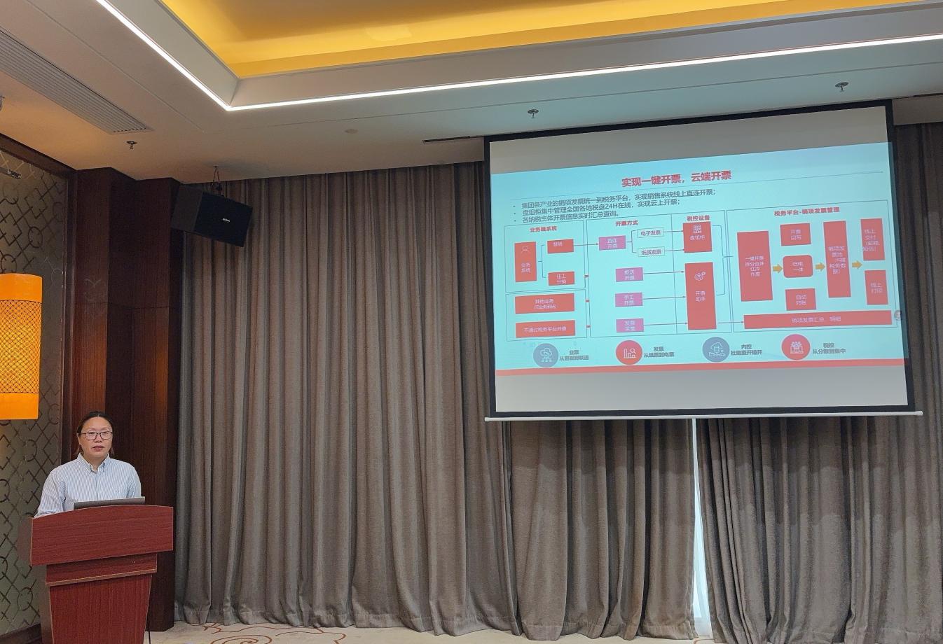 随后,用友集团公司张小茹经理以《企业税务数字化解决方案与案例剖析》 为主题,结合用友在税务数字化领域的服务经验,向参访教师介绍了当前行业的通用解决方案框架、跨行业案例及与企业协同实践