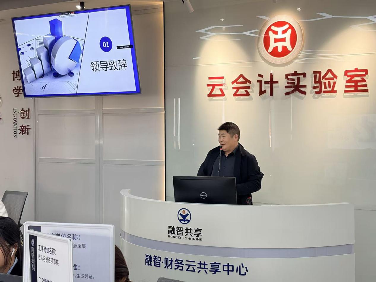会计学院副院长周书域在致辞中向顺利完成实训的同学们表示祝贺,并强调产业学院是推动产教融合、衔接理论与实务的重要平台。他指出在财务数智化转型的背景下,具备扎实技能与流程思维的会计人才尤为珍贵。希望同学们能将实训中所学的严谨态度、规范操作与问题解决能力延续至未来的学业与职业生涯中,持续学习、不断突破。