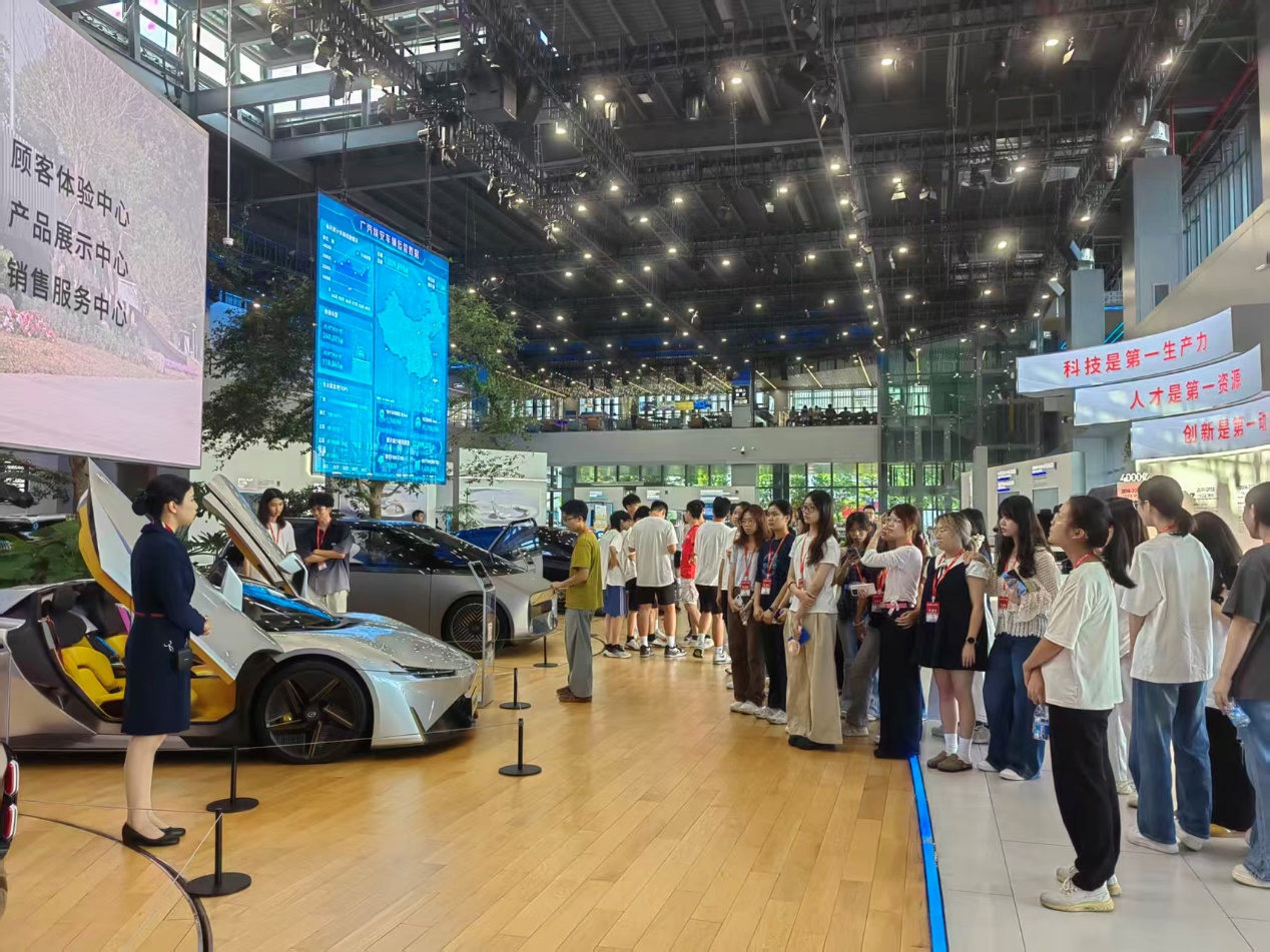 随后,师生前往广汽科技馆,由科技馆专业讲解员带领同学们进行参观,讲解员为大家介绍了广汽集团行业领先的电池技术、智驾技术等,充分展示了企业的核心竞争力。在自动驾驶体验区,学生还亲身感受了智能驾驶的科技魅力,也从企业创新实践中理解到技术研发投入与税收优惠政策之间的内在联系——高强度的研发背后,离不开税收政策的支持与引导。